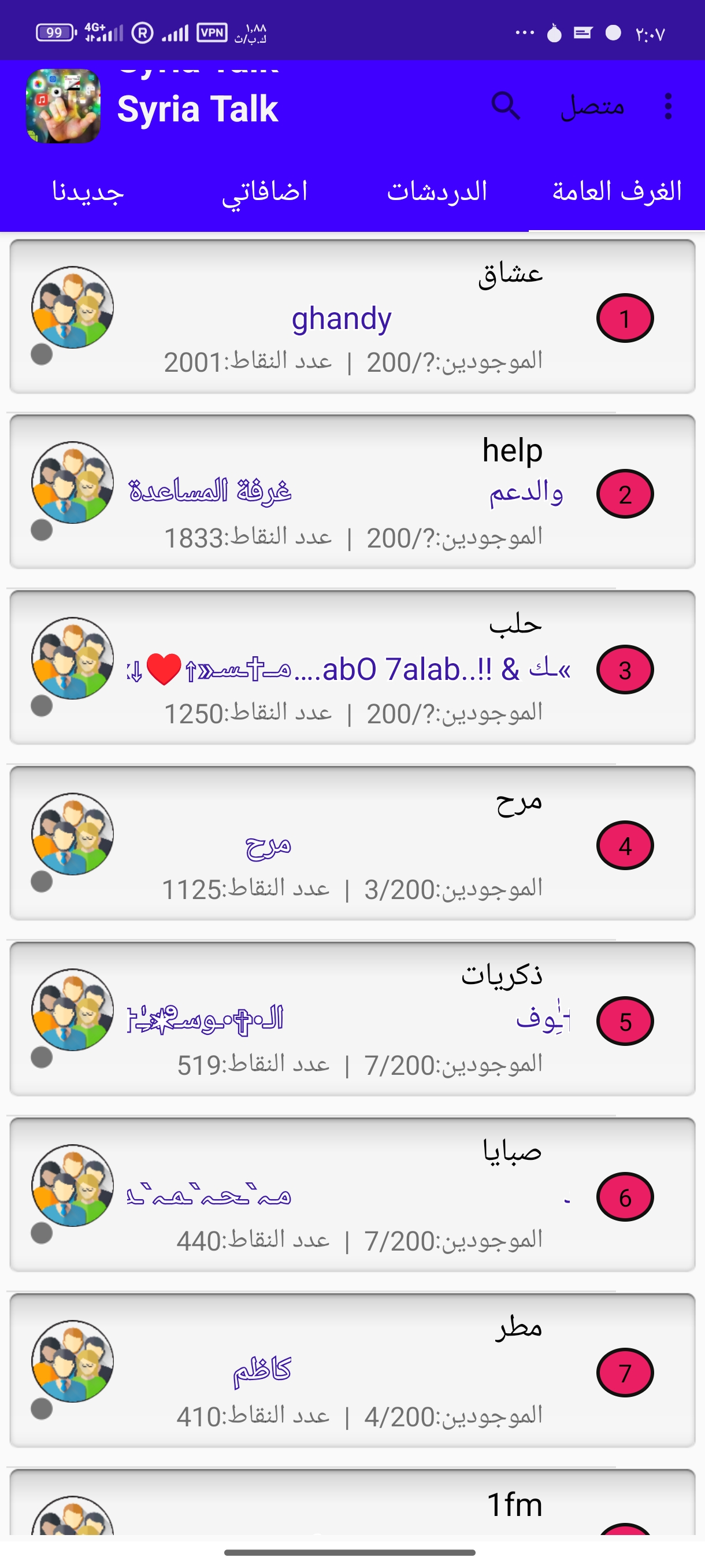 غرف عامة متعددة للتواصل والتعارف.